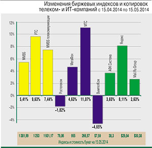 С 15 апреля до 15 мая индекс ММВБ вырос на 5,41% (до 1381,99 п.), а долларовый индекс РТС увеличился на 9,64% (до 1253 п.). Отраслевой индекс «ММВБ телекоммуникации» прибавил 7,44% (до 1931,17 п.). |