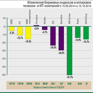 С 15 сентября по 15 октября индекс ММВБ снизился на 5,3% (до 1377,09 п.), индекс РТС упал на 10,7% (до 1067,06 п.). Отраслевой индекс «ММВБ телекоммуникации» снизился на 16,5% (до 1809,5 п.).