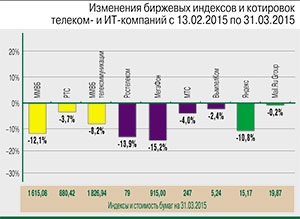 На российском финансовом рынке также сохранялась повышенная волатильность. Так, с 15 февраля по 31 марта рубль существенно укрепился к основным валютам: доллар США подешевел на 8,3%, до 58,2 руб., а евро – на 13,7%, до 62,5 руб. Стоит отметить, что рассчитываемый в рублях индекс телекоммуникаций (MICEXTLC) Московской биржи показал превосходящую ММВБ динамику: за полтора месяца его потери составили менее 8,2% (до 1827 пунктов). Таким образом, данный бенчмарк выбрался из группы аутсайдеров среди отраслевых индексов. Однако, если копнуть глубже, станет ясно, что на этот раз фактически единственной его поддержкой оказались котировки МТС. Все другие входящие в отраслевой индекс акции публичных телекомов показали динамику значительно хуже ММВБ. Не было заметно позитива и среди торгующихся в США и Лондоне расписок российских ИТ-компаний, которые не учитываются в индексе.