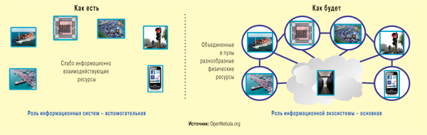 Такая смена парадигмы заключается в переходе от главенствующей в настоящее время платформоцентрической модели управления сложными организационно-техническими системами (СОТС), характеризующейся слабым информационным взаимодействием ее элементов, к облачной/сетецентрической модели, в которой информационные взаимосвязи играют определяющую для всех остальных видов взаимосвязей роль. И это диктует принципиально иные требования к облику элементов СОТС, включая физические объекты, рассматриваемые как ресурсы СОТС.