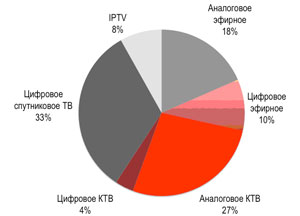 Очевидно, что эволюция ТВ-технологий набирает обороты, но процесс этот протекает гораздо медленнее, чем представлялось 3-4 года назад, что и послужило одной из причин переноса полного отказа от аналоговой технологии вещания на конец 2018 г. Подтверждением тому, что это решение оправданно, является тот факт, что при гипотетической доступности цифрового эфирного вещания почти двум третям телевизионных домохозяйств России, реальное количество тех, кто пользуется цифровым эфиром, оценивается в чуть более 10% общей численности телевизионных домохозяйств: до сих пор сказывается отсутствие ресиверов и низкий процент обновления парка телевизоров.