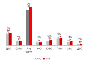 | Темпы роста рынка платного ТВ по ФО, 2014 |