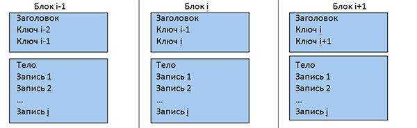 Как следует из названия технологии, в ее основе лежит цепочка последовательно связанных блоков. Новые блоки всегда добавляются строго в конец цепочки. Блок в блокчейне состоит из заголовка и тела, содержащего записи. Блоки связаны с помощью ключей: в заголовке каждого блока хранится ключ предыдущего блока. Это обеспечивает защищенность сети.