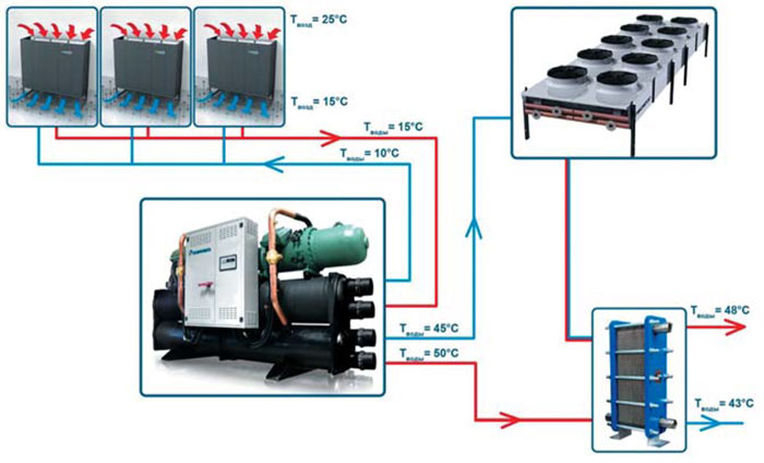 При использовании холодильных установок, оснащенных функцией фрикуллинга, где в теплый период года тепло отводится холодильной машиной, а с понижением температуры окружающего воздуха ниже температуры хладоносителя – через теплообменник «вода –воздух» минимальное значение этого коэффициента составит 1,3.