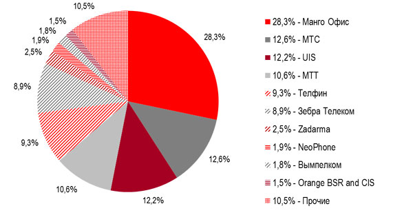 Лидером рынка виртуальных АТС является компания «Манго Офис» с долей в 28%, в тройку призеров также входят компании МТС (13%) и UIS (12%).