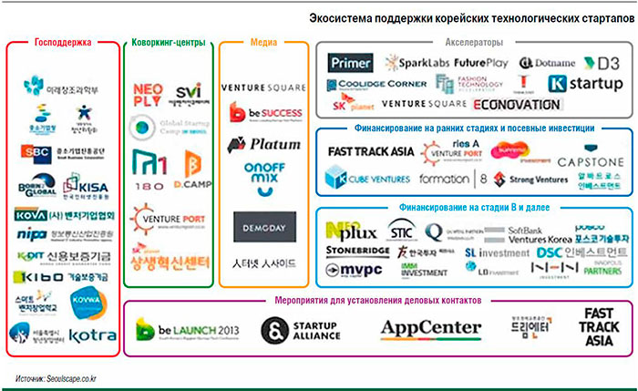 Государственная и корпоративная поддержка этого сегмента предпринимателей постоянно растет. Согласно исследованиям Seoul Space, одного из ведущих корейских стартап-инкубаторов, и G3 Partners, агентства, специализирующегося на продвижении молодых компаний, основными элементами стремительно растущей экосистемы стартапов Южной Кореи являются 20 крупнейших акселераторов, 40 крупнейших корейских инвесторов и полтора десятка государственных агентств, а также тысяча ангелов-инвесторов.