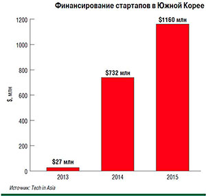 В течение нескольких последних лет корейская экосистема стартапов находится на подъеме. Согласно отчету Tech in Asia, с 2013-го по 2015 гг. финансирование стартапов выросло примерно в 40 раз (см. рисунок).