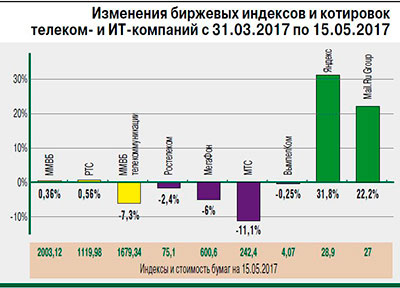 Справка ИКС ![]() С 31 марта по 15 мая 2017 г. индекс ММВБ вырос на 0,4%, поднявшись до 2003 пунктов. Индекс РТС завершил торги у отметки 1120 пунктов, прибавив 0,56%. Индекс телекоммуникаций Московской биржи (MICEXTLC) продемонстрировал снижение на 7,3%, до 1679 пунктов. |