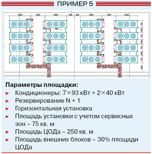 Исходя из опыта реализованных проектов (см. примеры 4 и 5), можно принять, что для размещения внешних блоков фреоновых кондиционеров требуется 30–35% площади машинных залов ЦОДа.