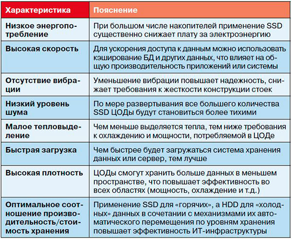 Оборудование, используемое в дата-центрах, должно быть способно бесперебойно работать в режиме 24×7, обеспечивать высокую производительность, легко масштабироваться, настраиваться и управляться, а также отличаться адекватной стоимостью владения. Применение в ЦОДах накопителей SSD отвечает практически всем этим требованиям (см. таблицу).