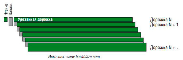 Увеличению плотности хранения и общей емкости накопителя служит и технология черепичной магнитной записи (Shingled Magnetic Recording, SMR). Суть технологии в том, что новая записываемая дорожка перекрывает часть ранее записанной дорожки (рис. 4). Предыдущая дорожка сужается, т.е. плотность записи повышается. Этот подход был выбран потому, что из-за физических ограничений записывающие головки нельзя сузить настолько же, насколько считывающие головки.