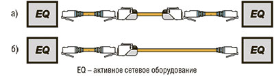 Однако массовому внедрению оптических линий во вновь создаваемые ИТС препятствует сложность обеспечения дистанционного питания одиночных терминальных устройств. Такое питание требует применения комбинированных волоконно-оптических кабелей с интегрированными в них выделенными медными жилами. Определенное значение имеют также более высокая стоимость и меньшая надежность оптических линий из-за неизбежного появления в цепи передачи двух дополнительных преобразований сигналов – из электрической формы в оптическую на передаче и обратно на приеме. Поэтому основным кандидатом на формирование линейной части «длинного» Ethernet становятся симметричные кабели.