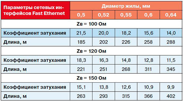 | Расчетные величины коэффициента затухания и дальности связи сетевых интерфейсов Fast Ethernet |