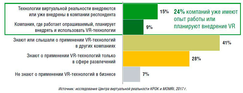 Более 40% опрошенных сообщили, что знакомы с примерами внедрения виртуальной реальности в других компаниях. Участники исследования называли решения для промышленного, строительного и инженерного проектирования, продаж жилой недвижимости, виртуальные обзоры производственных объектов, применение VR в обучении сотрудников (тренажеры и симуляторы). Почти четверть – 24% – представителей российского бизнеса заявили, что в их компаниях VR-технологии уже внедрены или их внедрение планируется.