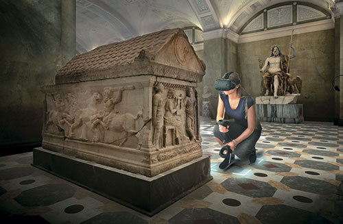 Ведущие российские музеи, несмотря на консервативность, также видят перспективы во внедрении VR и AR. Здесь потенциал технологий виртуальной реальности заключается в создании нового опыта посещения музея и сохранении музейных ценностей в формате цифровых копий, а также в расширении экспозиционных возможностей. Первым из российских музеев заинтересовался такими проектами Государственный Эрмитаж. В ходе совместного с музеем проекта специалистами Центра виртуальной реальности КРОК создана виртуальная копия зала Юпитера, полностью повторяющая его интерьер и 46 экспонатов (рис. 4). Теперь с помощью технологий виртуальной реальности можно познакомиться с богатейшей коллекцией античного искусства, не посещая Эрмитажа.