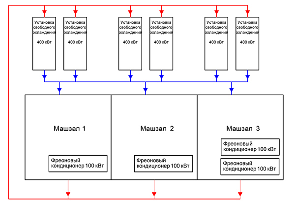 В любом случае при выходе из строя одной из установок свободного охлаждения недостающие 400 кВт холода будут генерировать фреоновые кондиционеры. Размещение кондиционеров в разных машинных залах позволяет сохранить равномерную работу «оставшихся в живых» установок свободного охлаждения, а в самом худшем случае при крахе всей системы фрикулинга обеспечить хоть какое-то охлаждение в каждом из машинных залов.