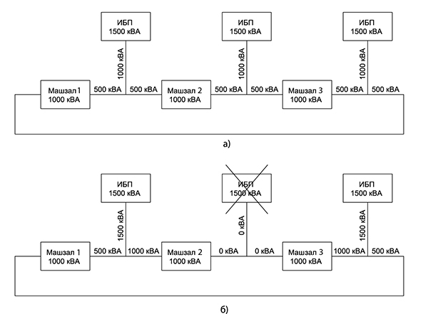 Важно отметить следующее свойство схемы дробного резервирования. При необходимости (например, при ремонте одной из питающих трасс) каждый машинный зал может быть переведен в режим питания от второго блока ИБП, к которому он подключен. Действительно, как было сказано выше, машинный зал мощностью 1000 кВА получает по 500 кВА от первого и второго блоков ИБП. Между тем блоки ИБП имеют номинальную мощность 1500 кВА, а фактически вырабатывают только 1000 кВА. При отключении машинного зала от первого блока ИБП недостающие 500 кВА он получит от второго блока ИБП, загрузив его на полную мощность (рис. 2, б).
