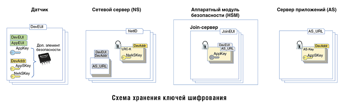 DevAddr, NwkSKey и AppSKey сохраняются в памяти абонентского устройства, DevAddr, NwkSKey – на сетевом сервере, а AppSKey – на сервере приложений.