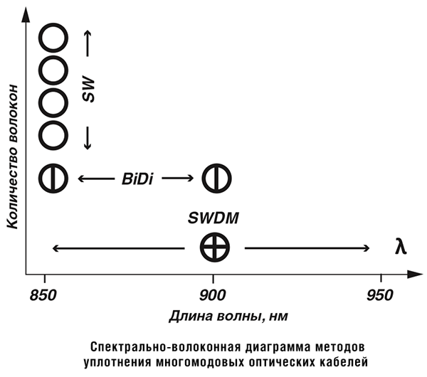 Схема параллельной передачи реализуется как пространственное или спектральное мультиплексирование, причем последний способ применительно к экономически выгодному первому окну прозрачности и многомодовой технике известен в вариантах BiDi (двухволновая схема) и SWDM (четыре оптические несущие) (рис. 2).