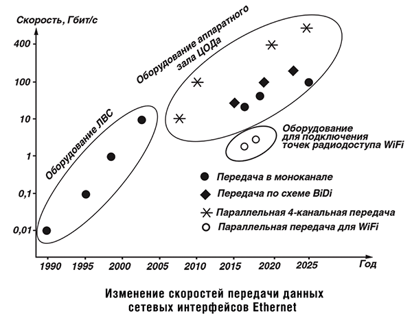 Шаг скоростей сетевых интерфейсов ЛВС сегодня уменьшается. Этот процесс обусловлен необходимостью полнее и с меньшими затратами удовлетворять сетевые потребности вычислительной техники в офисах и центрах обработки данных.