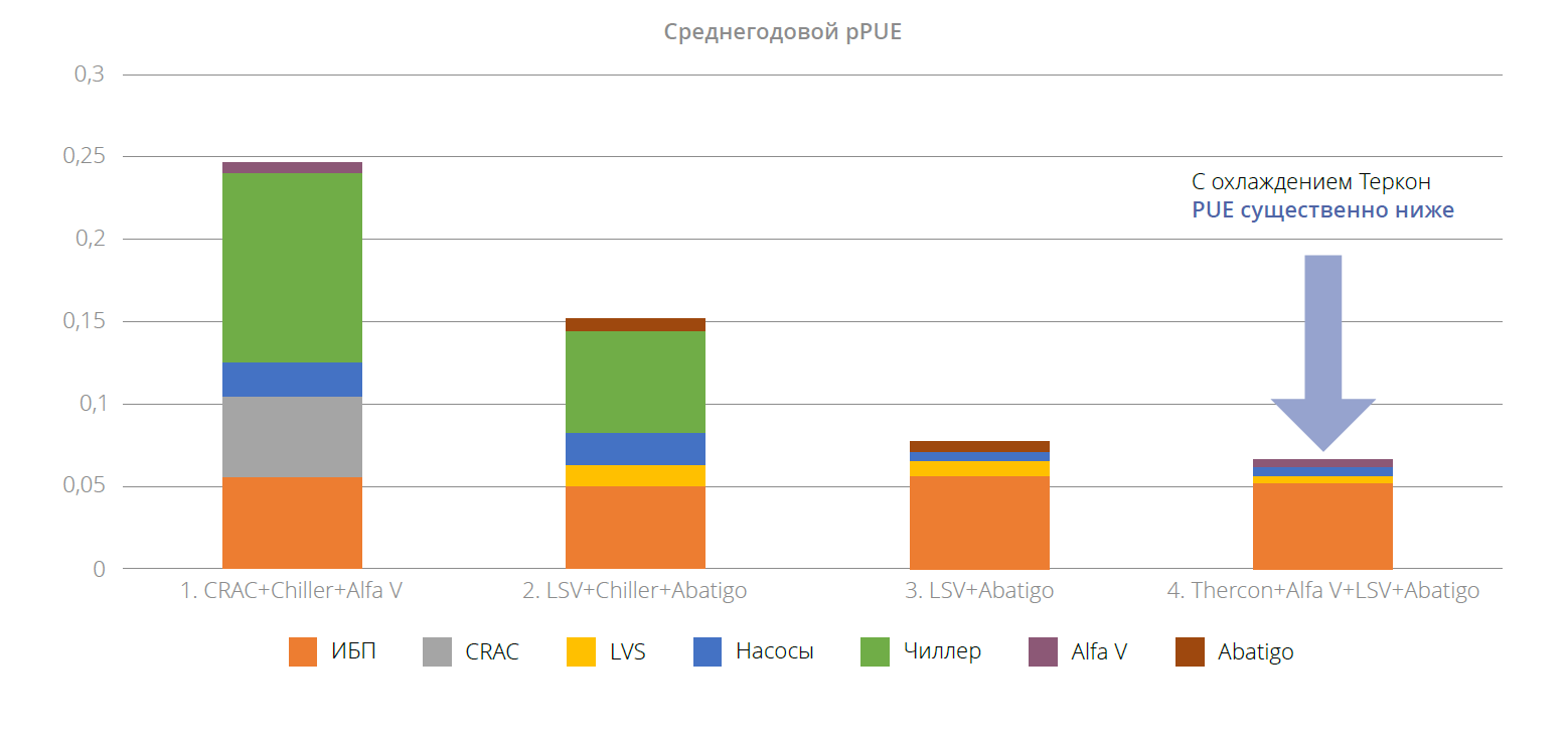 Представленные ниже результаты расчетов показывают, что наименьшее значение pPUE (1,05) имеет система с использование трубок «Теркон» (LHP).