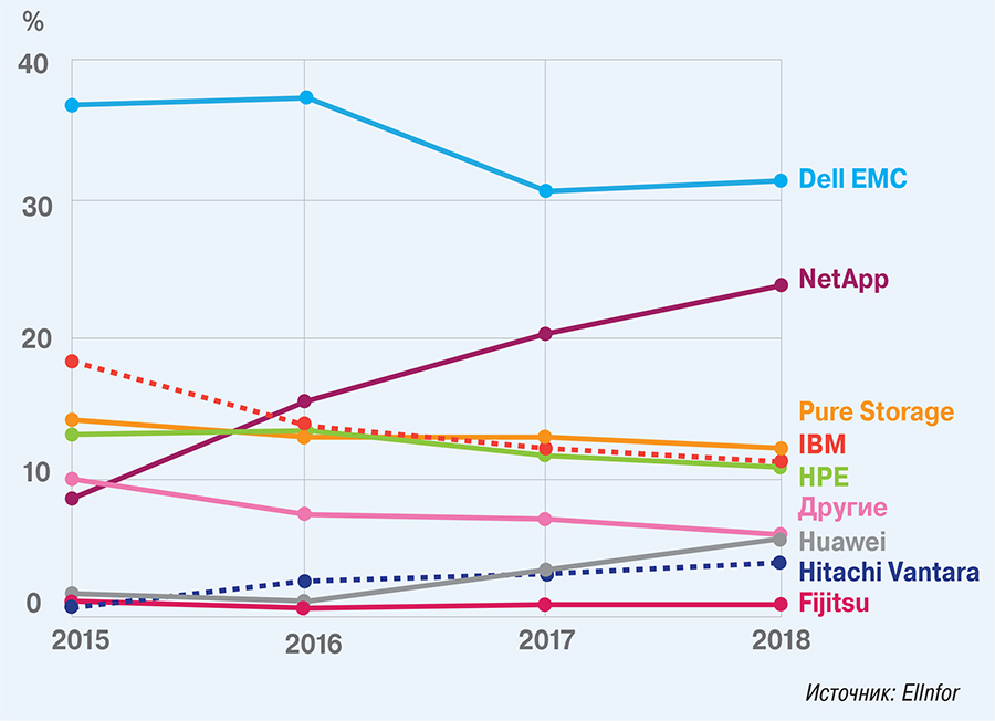 Рис. 4. Изменение долей рынка флеш-массивов ведущих вендоров в 2015–2018 гг.