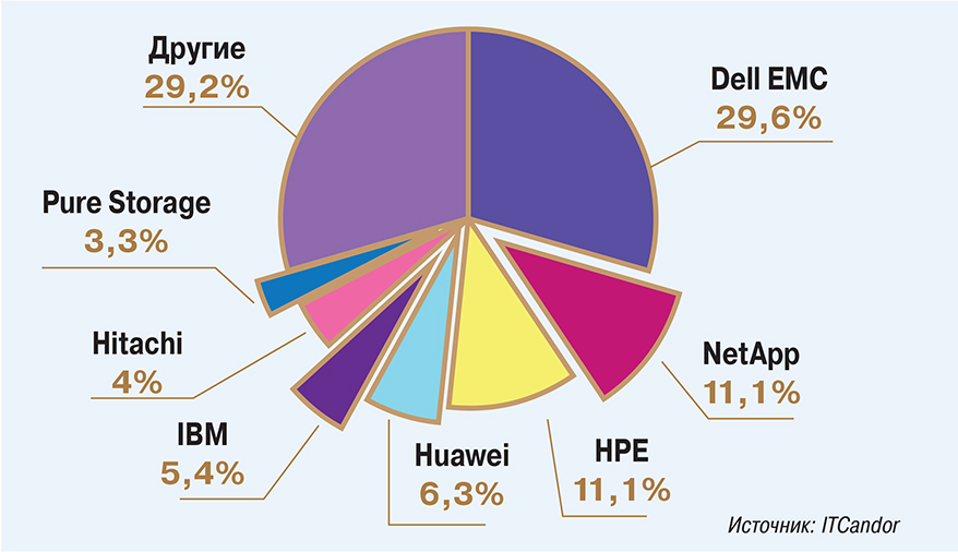 Крупнейшим в мире вендором внешних СХД, согласно IDC, остается Dell EMC с долей 30%. Она опережает HPE (11,7%) и NetApp (10,8%), за которыми следуют IBM и Hitachi. Интересно, что другие аналитические агентства дают практически такие же оценки (рис. 1).