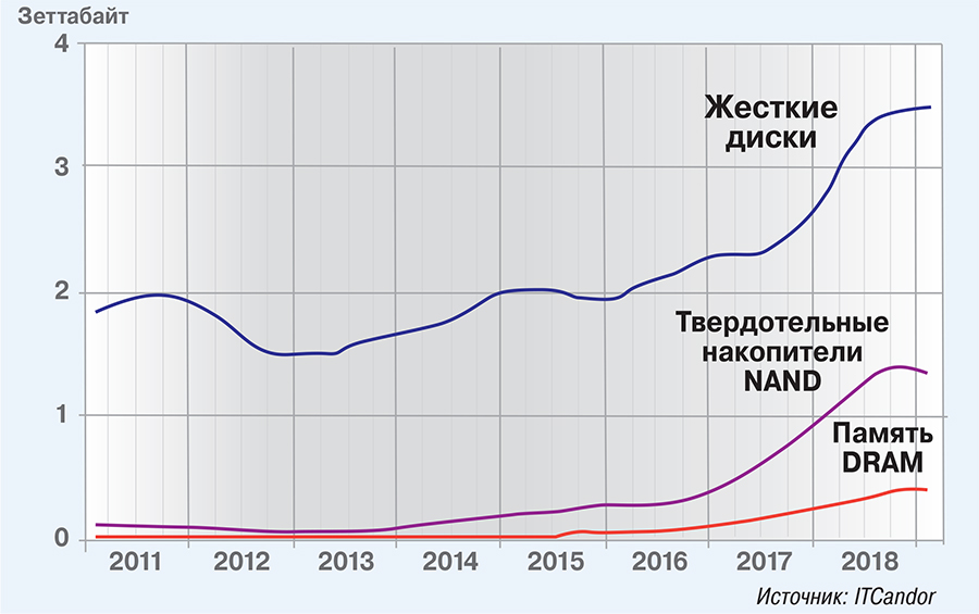 Следует отметить, что несмотря на серьезное снижение стоимости хранения 1 Гбайт на флеш-накопителях, HDD пока лидирует по емкости поставленных систем, и разрыв в течение последних пяти лет сохраняется (рис. 3).