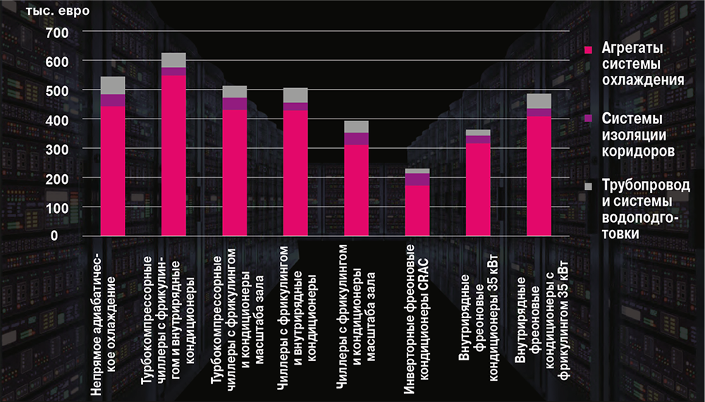 Анализ проводился в предположении, что ЦОД с инфраструктурой, отвечающей требованиям Tier III, расположен в Москве и имеет ИТ-нагрузку 250 кВт (32 шкафа с удельной нагрузкой 7,81 кВт на шкаф). Для расчетов стоимость 1 кВт*ч электроэнергии принималась равной 4,36 руб. (примерно 0,06 евро).