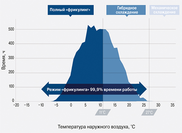 Благодаря увеличенным теплообменникам естественного охлаждения (драйкулерам) ХМ обеспечивает полную холодопроизводительность уже при температуре наружного воздуха 11°C при уставке по прямому х/н 20°С. Это означает, что значительную часть времени ХМ может удовлетворить потребности в охлаждении без использования компрессоров, т.е. работать с максимально возможной эффективностью (рис. 3).