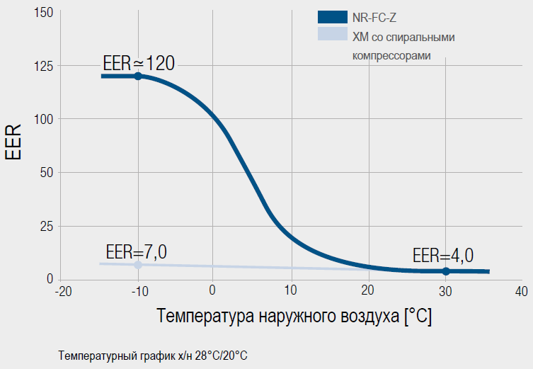 Современное ИТ-оборудование готово для работы при температурах, превышающих традиционно принятые для серверных залов, что позволяет повысить эффективность системы охлаждения и снизить PUE ЦОДа. Охлаждающее оборудование развивается вместе с ИТ-инфраструктурой, поэтому машина NR-FC-Z была оптимизирована для работы с температурами 28°/20°C, обеспечивая более высокий КПД (EER до 4,1) и сводя к минимуму энергопотребление насоса благодаря специальной конструкции теплообменника, которая допускает пониженный расход х/н (ΔT до 11°C). ХМ NR-FC-Z уже сейчас способна работать при температуре выходящего х/н до 24°C (рис. 2).