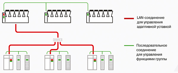 - Адаптивная уставка. Контроллер координирует работу ХМ и внутренних потребителей, чтобы оптимизировать работу системы при частичной нагрузке. Каждая группа потребителей (до 20 групп) передает информацию о своей загрузке в режиме реального времени. Интеллектуальный алгоритм анализирует сигналы всех внутренних групп и при необходимости меняет уставки холодильной машины (рис. 6).