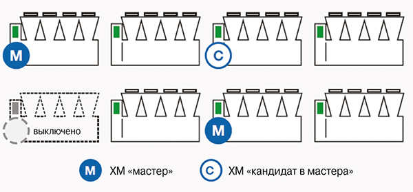 - «Динамический мастер» (Dynamic Master) с приоритетом назначения. Когда главная ХМ отключается, контроллер назначает другую ХМ в качестве главной, позволяя системе холодоснабжения продолжать функционировать. Инженер службы эксплуатации может заранее выбрать «кандидата в мастера» (рис. 5).