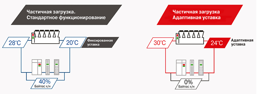 При полной нагрузке система работает с параметрами х/н 28/20°С, и внутренние блоки получают расчетный номинальный расход х/н. В традиционной системе с постоянным расходом при частичной нагрузке трехходовой клапан регулирует расход х/н через внутренний блок (и через байпас). С функцией адаптивной уставки трехходовой клапан прикрывает байпас, а контроллер ХМ повышает уставку (т.е. температуру выходящего х/н), в результате чего существенно снижается энергопотребление всей системы холодоснабжения (рис. 7). Благодаря этим функциям можно подключить более 300 установок (16 ХМ + 20 групп потребителей по 16 терминалов в каждой) без какого-либо внешнего оборудования и без дополнительных капзатрат.