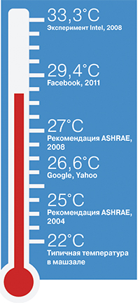 В течение многих лет идеальным для ИТ-оборудования считался диапазон температур 20–22°C (рис. 1). В 2004 г. Американское общество инженеров по отоплению, холодильному оборудованию и кондиционированию воздуха (ASHRAE), основываясь на своих исследованиях и рекомендациях производителей оборудования, рекомендовало диапазон рабочих температур от 20 до 25°C. Видя преимущество в снижении энергопотребления, проектировщики и операторы ЦОДов подняли температуру ближе к верхнему пределу 25°C.