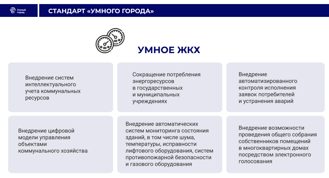 В принятом в начале 2019 года Министерством строительства и жилищно-коммунального хозяйства РФ ведомственном стандарте «Умный город» есть отдельное направление – «умное» ЖКХ, определившее границы нового рынка. Маркетинговый термин «умное» ЖКХ получил «законодательное» закрепление через набор технологических решений для внедрения интеллектуальных систем управления инфраструктурой, жилфондом и социальными объектами, направленных на повышение эффективности энергетической и коммунальной инфраструктуры, снижение издержек ресурсоснабжающих организаций.