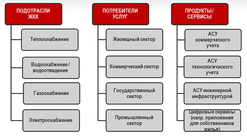 Партнер iKS-Consulting Татьяна Толмачева выделяет три группы игроков нового рынка: подотрасли ЖКХ (теплоснабжение, водоснабжение и отведение, газоснабжение), потребители услуг (жилищный и коммерческий сектор, государство и промышленность) и разработчики продуктов и сервисов – автоматизированных систем инженерной инфраструктуры, коммерческого и технологического учета, различных цифровых сервисов (рис. 3).