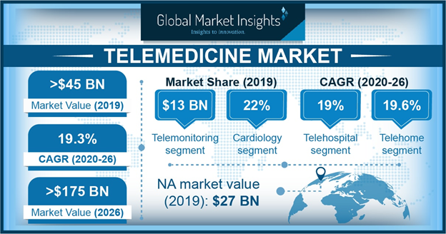 Объем мирового рынка телемедицинских услуг в 2019 г. составил $45 млрд. В ближайшее время он будет расти в среднем на 19,3% в год и может превысить $175 млрд к 2026 г., подсчитали аналитики Global Market Insights. Основная причина — рост числа людей, имеющих хронические заболевания. Серьезное влияние на рынок телемедицинских услуг окажет пандемия COVID-19. Уже сегодня, когда во многих странах мира была введена практика социального дистанцирования и самоизоляции, медицинские учреждения вынуждены были ограничить очный прием пациентов. Одновременно стало расти количество телемедицинских консультаций. Это подстегнуло развитие рынка телемедицины в режиме «врач-пациент», объем которого существенно меньше, чем «врач-врач».