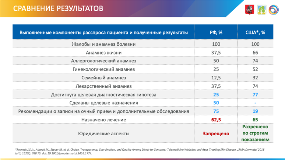 Рынок телемедицинских услуг во всем мире растет за счет сегмента удаленных консультаций пациентов. Однако в России качество телемедицинских консультаций «врач-пациент» остается очень низким, считает Антон Владзимирский, заместитель директора по научной работе «НПКЦ диагностики и телемедицины». Для постановки диагноза и дачи рекомендаций пациенту, обратившемуся к телемедицинскому сервису, необходимо провести его подробный опрос. Сотрудниками института был разработан опросный лист и созданы два виртуальных пациента, которые обращались в самые популярные телемедицинские сервисы.
