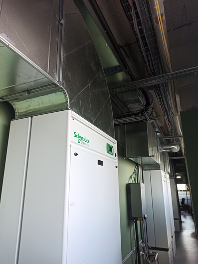 Обеспечение постоянного и бесперебойного энергоснабжения – основная задача при создании ЦОДа. Наш ЦОД отвечает всем требованиям уровня Tier II, а по ряду характеристик соответствует уровню Tier III. Электропитание осуществляется от двух независимых вводов от городской сети и подается одновременно на два комплекта ИБП (для основной и инженерной нагрузок). Каждый комплект ИБП подключен к отдельному ДГУ, рассчитанному на восьмичасовое отключение от основного источника электропитания. Чтобы не перегружать перекрытия здания, ИБП расположены на первом этаже здания, а ДГУ – в подвале. Кабельные линии ВОЛС и электропитания проложены по двум вертикальным стоякам в разных концах здания. В каждой стойке предусмотрены два PDU для бесперебойной работы оборудования с двумя блоками питания.
