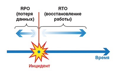 В утвержденных документах, как правило, содержатся параметры RPO (Recovery Point Objective), т.е. максимальный период времени, потерю данных за который можно считать допустимой, и RTO (Recovery Time Objective), время восстановления работы (см. рисунок).