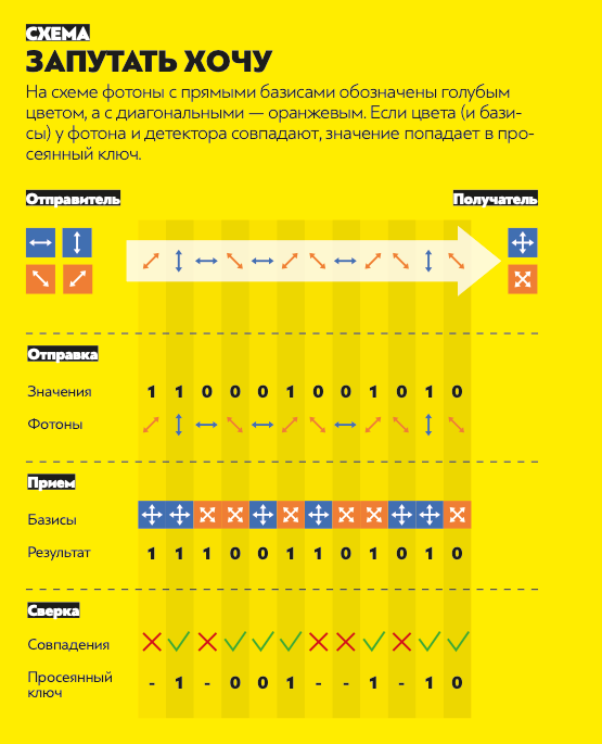 «Идея состоит в том, что отправитель должен пересылать фотоны, выбирая базовую плоскость (базис) для поляризации каждого из них случайно: либо прямую, либо диагональную, – объясняет Вадим Родимин. – Получатель измеряет эти частицы, тоже исходя из случайно заданных базисов. Если их выбор совпал, то поляризация будет установлена правильно, а если нет, то измерения дадут случайный результат». Чтобы понять, какие из измерений верны, отправитель и получатель обмениваются списками использованных базисов и сравнивают их. Измерения с несовпадающими базисами можно отбросить, получив «просеянный» ключ: случайную и одинаковую у обоих последовательность.
