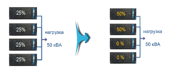 В таком режиме ИБП постоянно отслеживает текущий уровень нагрузки относительно суммарной максимальной мощности установленных в ИБП силовых блоков. При уменьшении нагрузки ниже наперед установленного уровня ИБП выводит некоторые модули из работы, сохраняя их синхронизацию. За счет перераспределения нагрузки между оставшимися в работе силовыми модулями происходит повышение их КПД и КПД ИБП в целом.