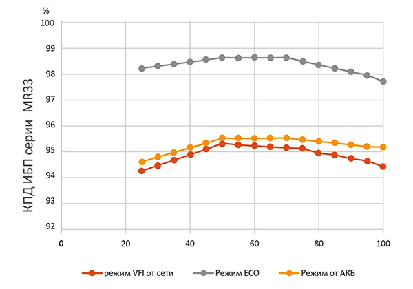 Высокий КПД MR33, не опускающийся в режиме двойного преобразования ниже 94% в диапазоне нагрузок от 20 до 100% – очень хороший показатель даже для моноблочных систем.