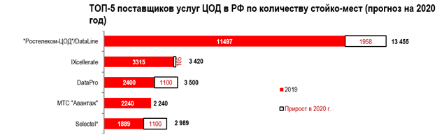 На втором месте – сеть дата-центров IXcellerate (3 315 стойко-мест) c долей 8,1%. На третьем месте компания DataPro (2 400 стойко-мест) c долей 5,8%, на четвертом – ЦОД «Авантаж», который ввел в 2019 году порядка 1 680 стойко-мест. Суммарная емкость по состоянию на конец 2019 года – 2 240 стойко-мест. Пятое место у компании Selectel, разместившей 1 889 стоек в шести дата-центрах, расположенных в Москве и Санкт-Петербурге (4,6% рынка).