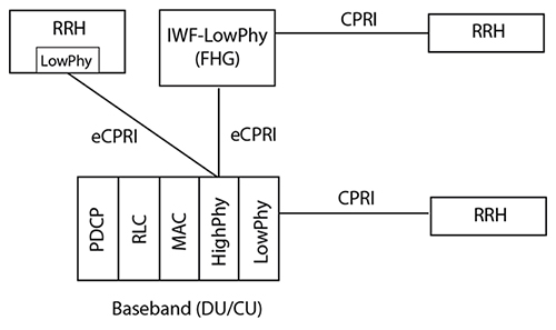 Эти недостатки подтолкнули традиционных производителей RAN к тому, чтобы специфицировать интерфейс eCPRI, который предполагает перенос части низкоуровневых функций цифрового стека DU/CU (часто называемого LowPhy) из централизованного вычислительного пула в RRH либо выделение его в отдельный узел (Interworking Function, IWF-LowPhy), возможно, с его интеграцией в транспортные узлы доступа (Fronthaul gateway, FHG), как показано на рис. 4.