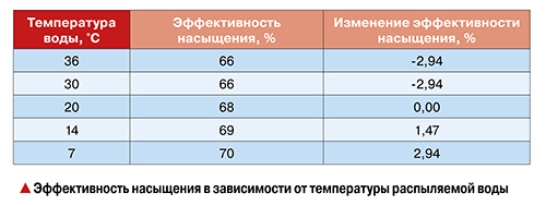 Изменение температуры распыляемой воды эффективность насыщения меняет незначительно (см. таблицу). Настолько незначительно, что совершенно не оправдывает затрат на получение охлажденной воды для орошения.