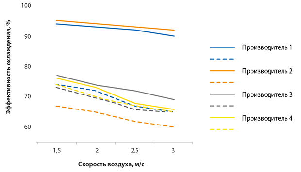 Производители панелей, как правило, декларируют эффективность охлаждения при скорости воздуха в диапазоне 0,5–3 м/с. В процессе исследования выяснилось, что половина производителей сильно переоценивает эффективность своих панелей. На рис. 2 сплошными линиями показаны графики эффективности охлаждения, заявленной четырьмя разными производителями PAD для панелей толщиной 150 мм, а пунктиром – реальные графики эффективности, полученные экспериментально.