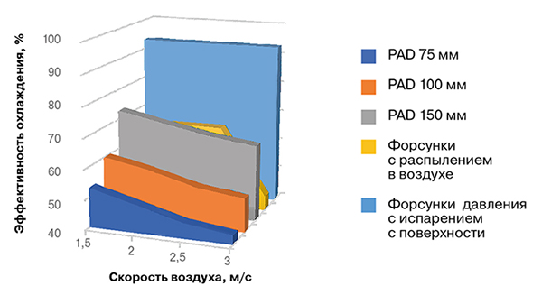 Максимальную эффективность в исследовании продемонстрировали системы адиабатического охлаждения с использованием форсунок (рис. 1). При этом испарительное охлаждение с поверхности оказалось самым эффективным и мало зависящим от скорости движения воздуха. При распылении воды в воздух эффективность ниже, при скорости воздуха до 2,5 м/с она остается практически неизменной, а при дальнейшем росте скорости эффективность охлаждения заметно снижается.