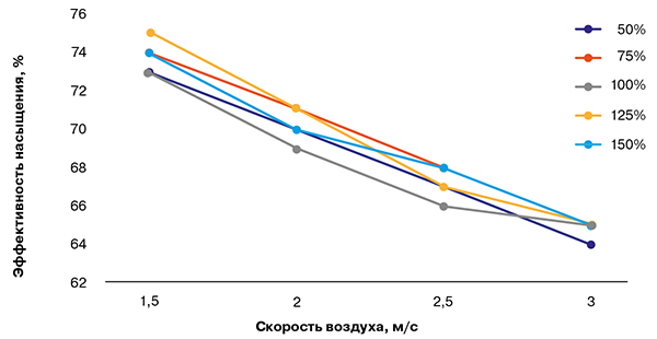 При изменении расхода воды в диапазоне 50–150% от номинальных 100%, рекомендуемых производителями адиабатических систем охлаждения PAD, эффективность насыщения от скорости воздуха зависит незначительно (рис. 4).